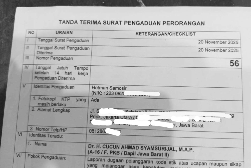 Pengaduan tersebut diajukan aktivis Hotman Samosir pada 20 November 2025 dan telah diterima secara resmi oleh Sekretariat MKD dengan Nomor Pengaduan 56.